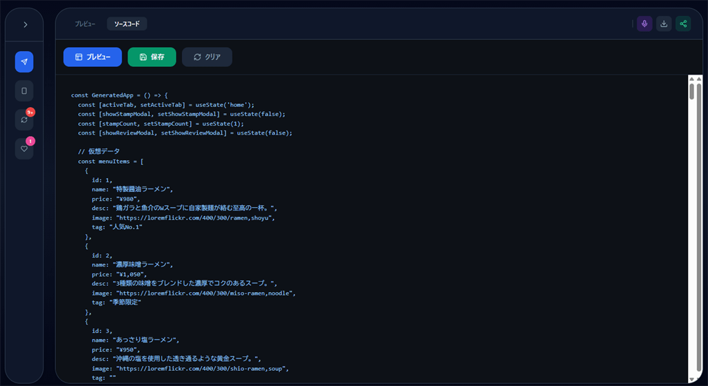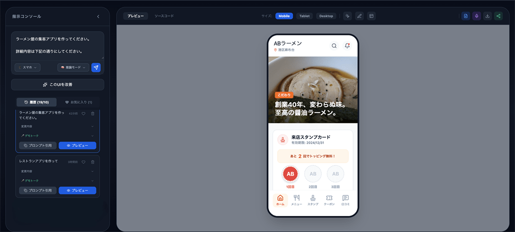 作成したいアプリの特徴やイメージを自然言語で入力するだけで、デバイス別に最適化されたモックアップを最短3分で作成できます。営業や企画職の方が、専門的なデザインツール等の知識がなくとも、その日から直感的に操作できる容易さを実現しています。