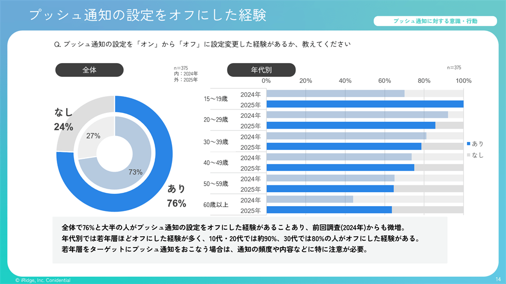 ・76%がプッシュ通知の設定をオンからオフに変更した経験があり、前年比でも微増している