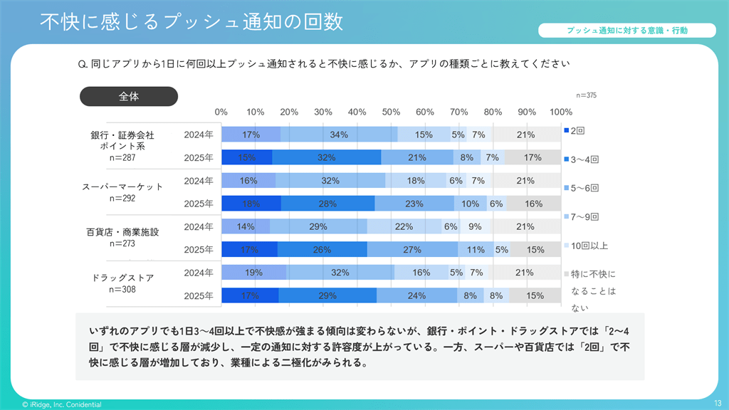 ・1日に不快に感じる通知回数について業種別で2024年調査と比較したところ、銀行やドラッグストアなど「わかりやすい実益のある通知」の多いアプリでは数回の通知に対する許容度が上がっている一方、プッシュ通知の強みが活かしづらいスーパーや百貨店では「1日2回」でも不快に感じる層が増加している
